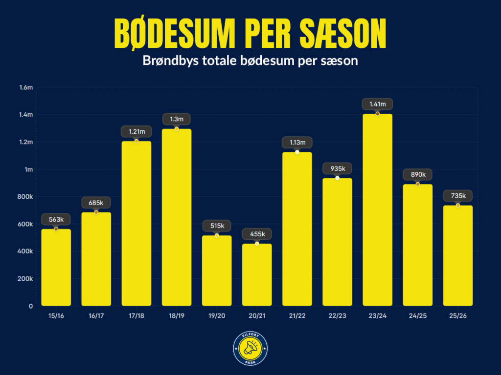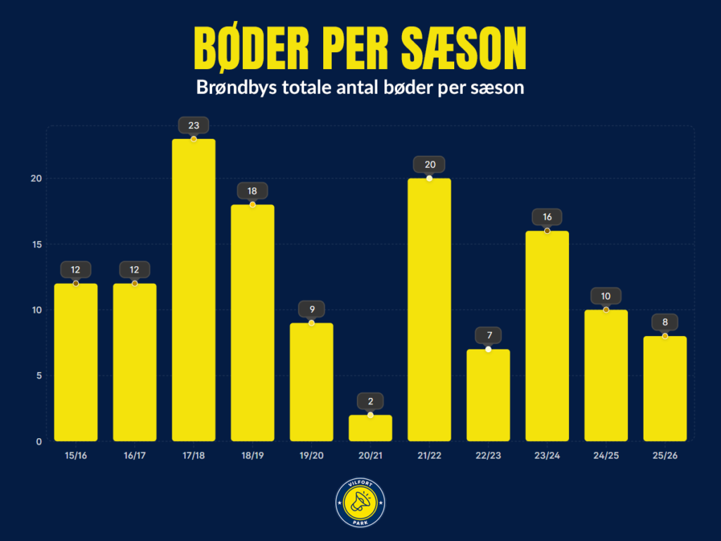 Den kedelige rekord for flest bøder i dansk fodbold satte Brøndby i 2017/2018, hvor fansene skaffede hele 23 bøder. Dengang endte Brøndby med at betale 1.205.000 kroner i bøder. fck fik i 2023/2024-sæsonen 22 bøder til en samlet værdi af 2.270.000 kroner.